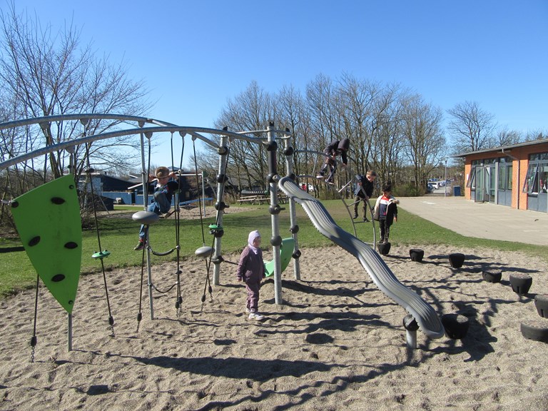 Børnene skifter mellem SFO og skole hver dag, og de møder dermed en lille overgang hver dag. Om morgenen hjælper vi helt praktisk børnene fra SFO-miljøet til skole-miljøet ved, at SFO-personalet fysisk er ude med børnene på legepladsen. Der er tid til at få frisk luft, lege på legepladsen og få hjælp til at komme ind i klassen, så alle er klar, når undervisningen begynder. Der bliver ringet med en klokke, når børnene kan begynde at gå ind og tage overtøjet af, så de oplever sig parate til at tage del i skolemiljøet, når skoleklokken ringer. Desuden er SFO-personalet opmærksomme på at give eventuelle beskeder videre til indskolingspersonalet. Når børnene går fra skole-miljøet til SFO-miljøet om eftermiddagen, sørger personalet fra indskolingen for, at konkrete informationer bliver givet videre om væsentlige ting, der er sket i løbet af dagen.